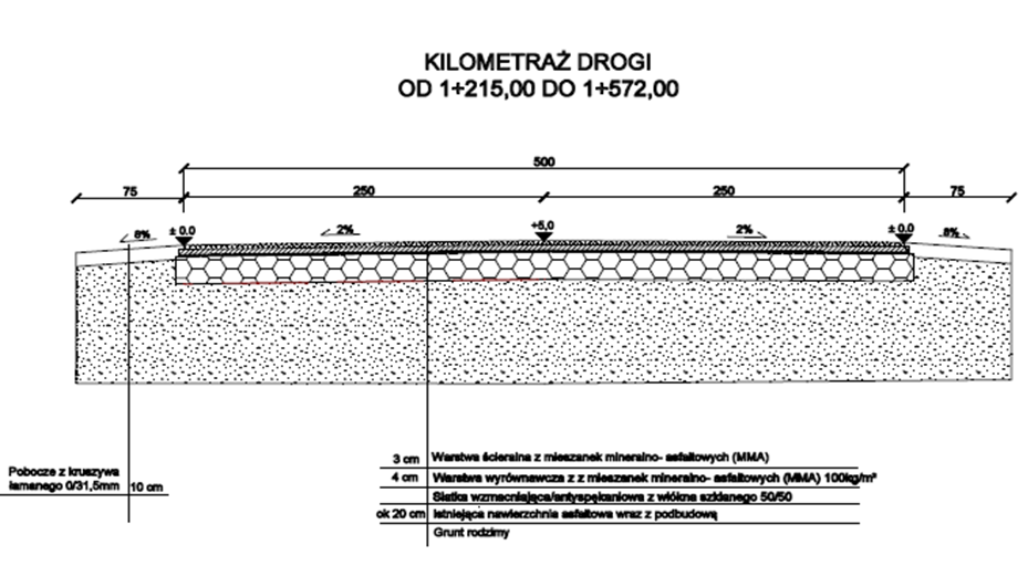 droga posiada również obustronne pobocza o stałej szerokości 75cm, wykonane z jednej warstwy