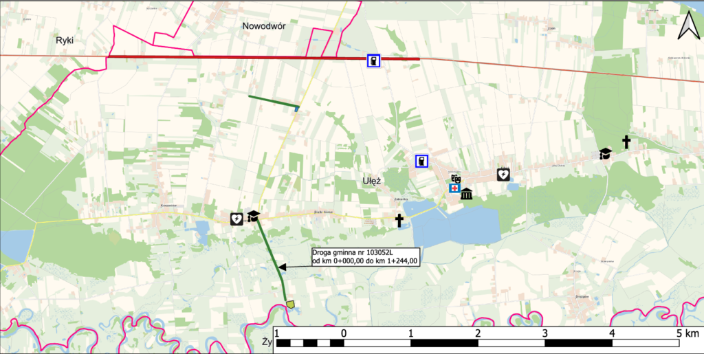 Zakres przedsięwzięcia obejmuje dla drogi gminnej nr 103052L na odcinku od km 0+000,00 do km 1+244,00. m.in.: